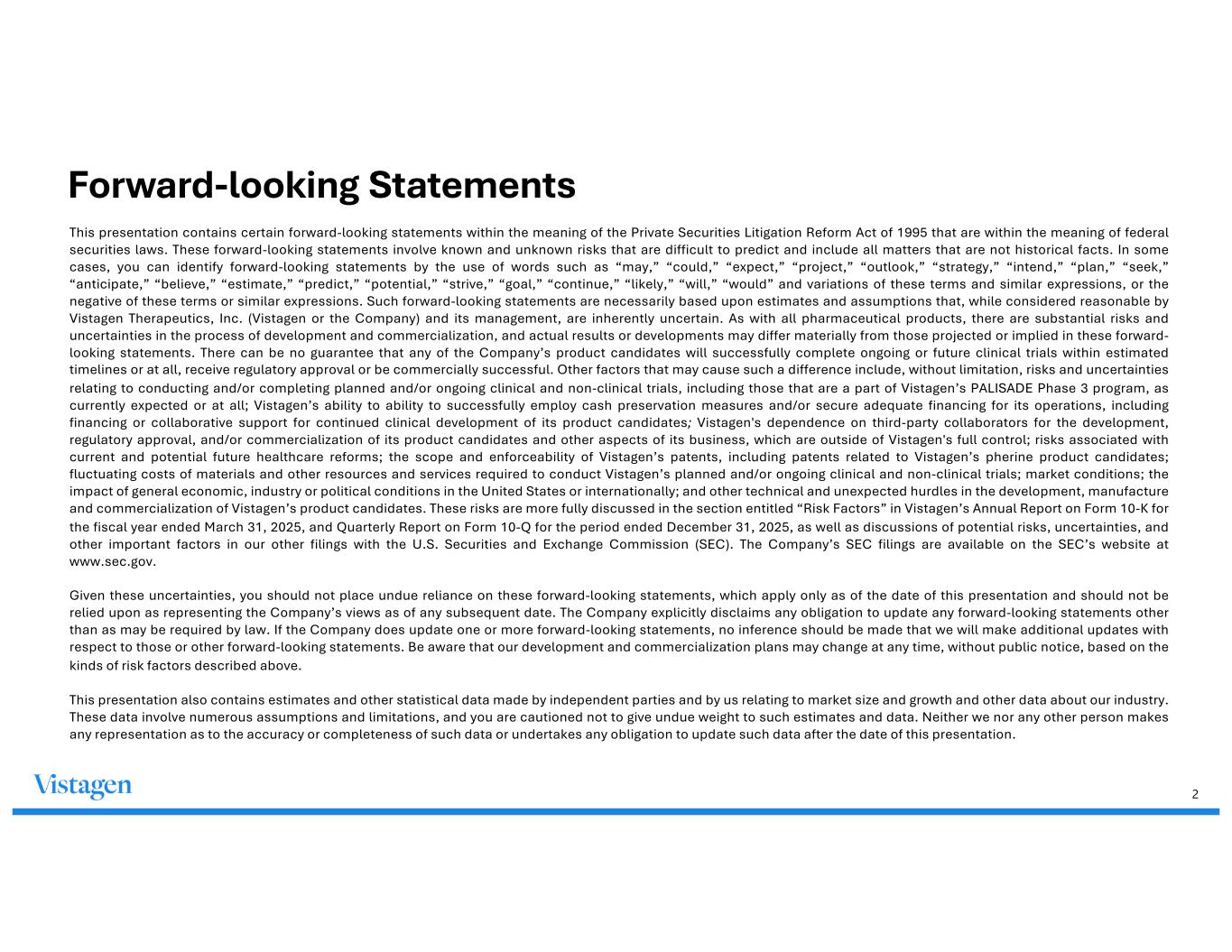2 Forward-looking Statements This presentation contains certain forward-looking statements within the meaning of the Private Securities Litigation Reform Act of 1995 that are within the meaning of federal securities laws. These forward-looking statements involve known and unknown risks that are difficult to predict and include all matters that are not historical facts. In some cases, you can identify forward-looking statements by the use of words such as “may,” “could,” “expect,” “project,” “outlook,” “strategy,” “intend,” “plan,” “seek,” “anticipate,” “believe,” “estimate,” “predict,” “potential,” “strive,” “goal,” “continue,” “likely,” “will,” “would” and variations of these terms and similar expressions, or the negative of these terms or similar expressions. Such forward-looking statements are necessarily based upon estimates and assumptions that, while considered reasonable by Vistagen Therapeutics, Inc. (Vistagen or the Company) and its management, are inherently uncertain. As with all pharmaceutical products, there are substantial risks and uncertainties in the process of development and commercialization, and actual results or developments may differ materially from those projected or implied in these forward- looking statements. There can be no guarantee that any of the Company’s product candidates will successfully complete ongoing or future clinical trials within estimated timelines or at all, receive regulatory approval or be commercially successful. Other factors that may cause such a difference include, without limitation, risks and uncertainties relating to conducting and/or completing planned and/or ongoing clinical and non-clinical trials, including those that are a part of Vistagen’s PALISADE Phase 3 program, as currently expected or at all; Vistagen’s ability to ability to successfully employ cash preservation measures and/or secure adequate financing for its operations, including financing or collaborative support for continued clinical development of its product candidates; Vistagen's dependence on third-party collaborators for the development, regulatory approval, and/or commercialization of its product candidates and other aspects of its business, which are outside of Vistagen's full control; risks associated with current and potential future healthcare reforms; the scope and enforceability of Vistagen’s patents, including patents related to Vistagen’s pherine product candidates; fluctuating costs of materials and other resources and services required to conduct Vistagen’s planned and/or ongoing clinical and non-clinical trials; market conditions; the impact of general economic, industry or political conditions in the United States or internationally; and other technical and unexpected hurdles in the development, manufacture and commercialization of Vistagen’s product candidates. These risks are more fully discussed in the section entitled “Risk Factors” in Vistagen’s Annual Report on Form 10-K for the fiscal year ended March 31, 2025, and Quarterly Report on Form 10-Q for the period ended December 31, 2025, as well as discussions of potential risks, uncertainties, and other important factors in our other filings with the U.S. Securities and Exchange Commission (SEC). The Company’s SEC filings are available on the SEC’s website at www.sec.gov. Given these uncertainties, you should not place undue reliance on these forward-looking statements, which apply only as of the date of this presentation and should not be relied upon as representing the Company’s views as of any subsequent date. The Company explicitly disclaims any obligation to update any forward-looking statements other than as may be required by law. If the Company does update one or more forward-looking statements, no inference should be made that we will make additional updates with respect to those or other forward-looking statements. Be aware that our development and commercialization plans may change at any time, without public notice, based on the kinds of risk factors described above. This presentation also contains estimates and other statistical data made by independent parties and by us relating to market size and growth and other data about our industry. These data involve numerous assumptions and limitations, and you are cautioned not to give undue weight to such estimates and data. Neither we nor any other person makes any representation as to the accuracy or completeness of such data or undertakes any obligation to update such data after the date of this presentation.