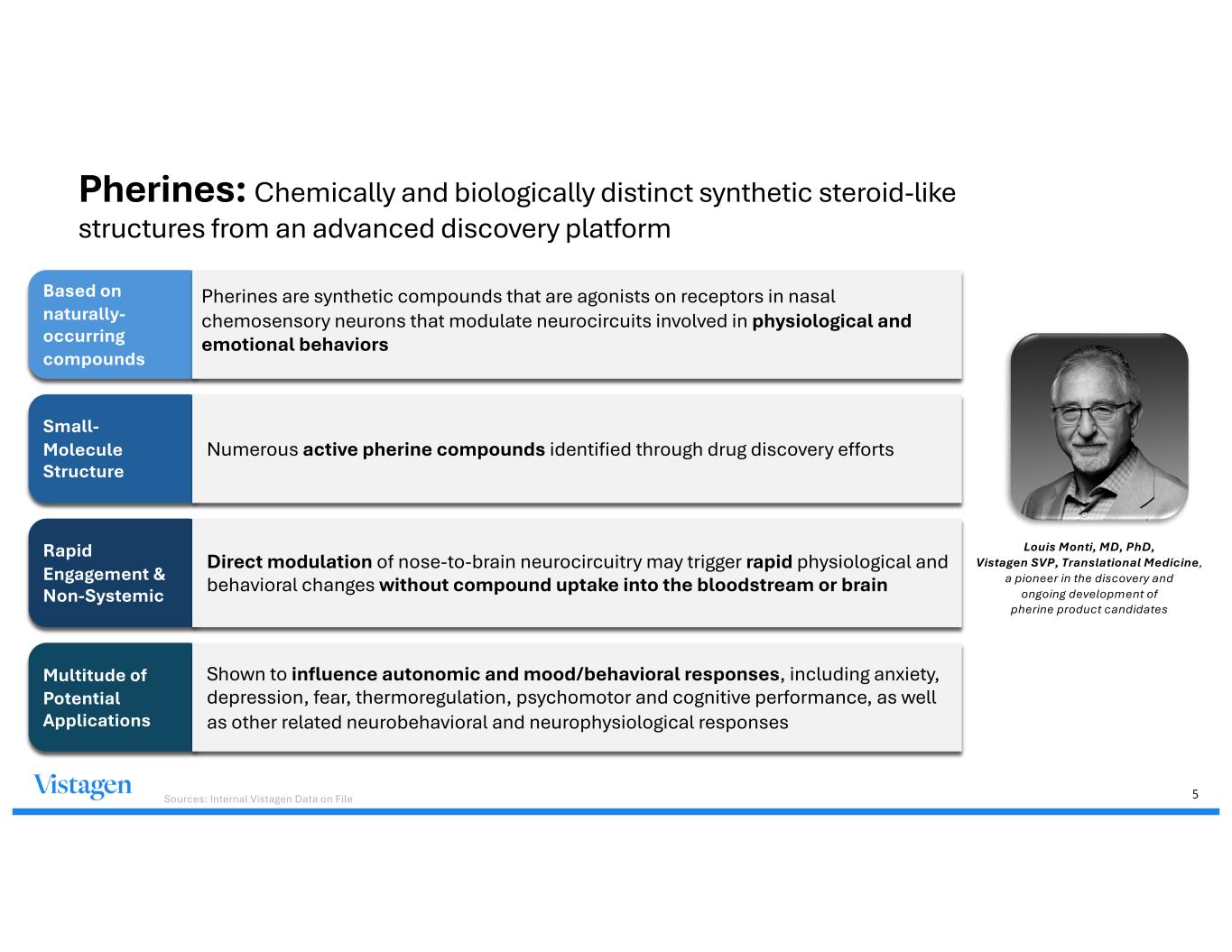 4 Company Highlights Pherines are a potential new class of rapid-onset intranasal product candidates Pherines are not absorbed systemically and do not act directly on neurons in the brain Diverse pipeline with five clinical-stage product candidates U.S. Phase 3 program for acute treatment of social anxiety disorder ongoing Large markets and partnering opportunities in several therapeutic areas and territories Positive clinical data in neuropsychology, women’s health and cancer supportive care
