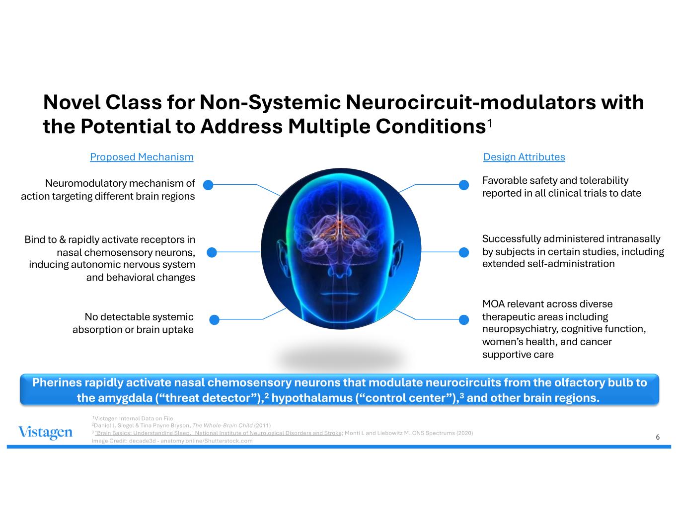 5 Pherines: Chemically and biologically distinct synthetic steroid-like structures from an advanced discovery platform Louis Monti, MD, PhD, Vistagen SVP, Translational Medicine, a pioneer in the discovery and ongoing development of pherine product candidates Based on naturally- occurring compounds Pherines are synthetic compounds that are agonists on receptors in nasal chemosensory neurons that modulate neurocircuits involved in physiological and emotional behaviors Small- Molecule Structure Numerous active pherine compounds identified through drug discovery efforts Rapid Engagement & Non-Systemic Direct modulation of nose-to-brain neurocircuitry may trigger rapid physiological and behavioral changes without compound uptake into the bloodstream or brain Multitude of Potential Applications Shown to influence autonomic and mood/behavioral responses, including anxiety, depression, fear, thermoregulation, psychomotor and cognitive performance, as well as other related neurobehavioral and neurophysiological responses Sources: Internal Vistagen Data on File