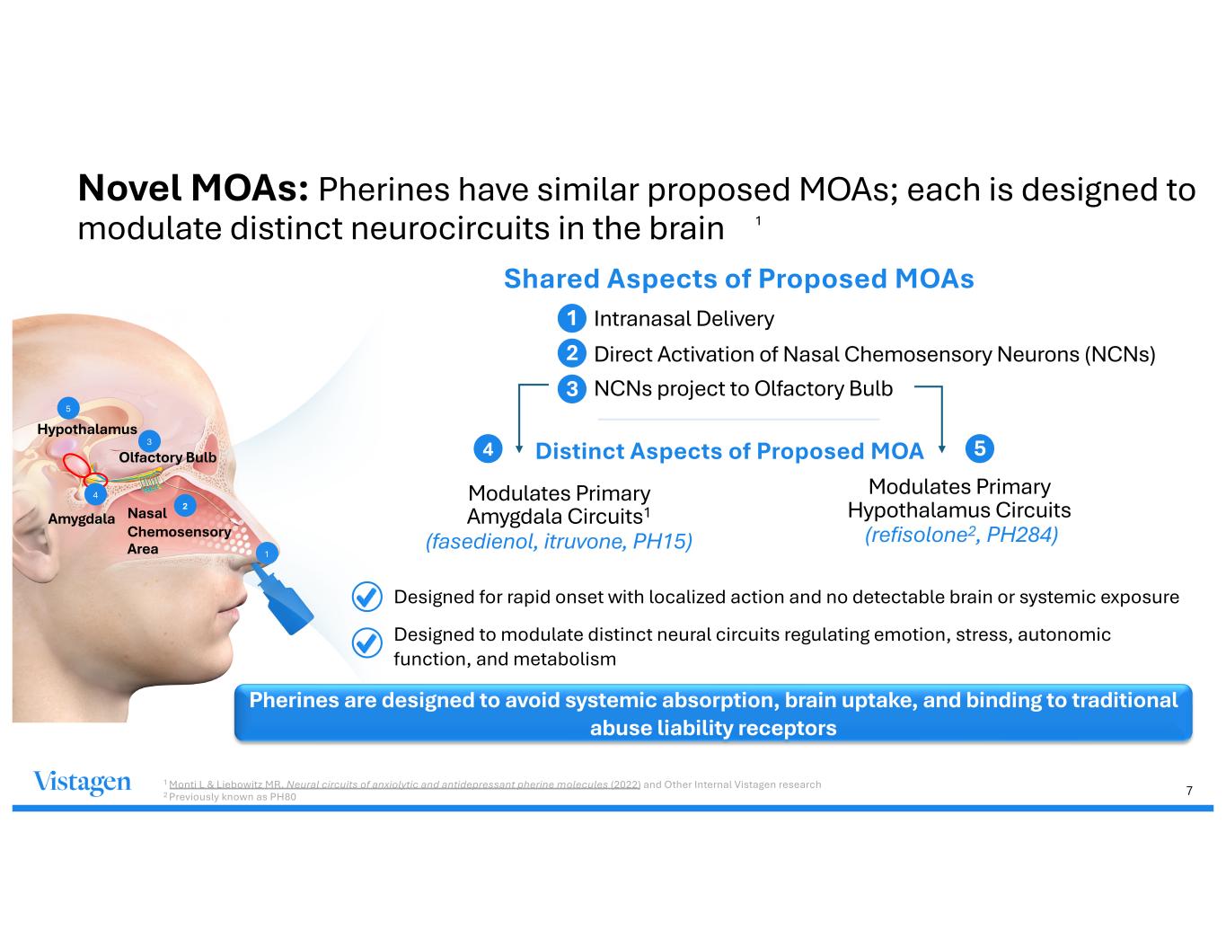 6 Favorable safety and tolerability reported in all clinical trials to date Bind to & rapidly activate receptors in nasal chemosensory neurons, inducing autonomic nervous system and behavioral changes Successfully administered intranasally by subjects in certain studies, including extended self-administration MOA relevant across diverse therapeutic areas including neuropsychiatry, cognitive function, women’s health, and cancer supportive care Novel Class for Non-Systemic Neurocircuit-modulators with the Potential to Address Multiple Conditions1 Pherines rapidly activate nasal chemosensory neurons that modulate neurocircuits from the olfactory bulb to the amygdala (“threat detector”),2 hypothalamus (“control center”),3 and other brain regions. No detectable systemic absorption or brain uptake Proposed Mechanism Design Attributes Neuromodulatory mechanism of action targeting different brain regions 1Vistagen Internal Data on File 2Daniel J. Siegel & Tina Payne Bryson, The Whole-Brain Child (2011) 3 "Brain Basics: Understanding Sleep," National Institute of Neurological Disorders and Stroke; Monti L and Liebowitz M. CNS Spectrums (2020) Image Credit: decade3d - anatomy online/Shutterstock.com