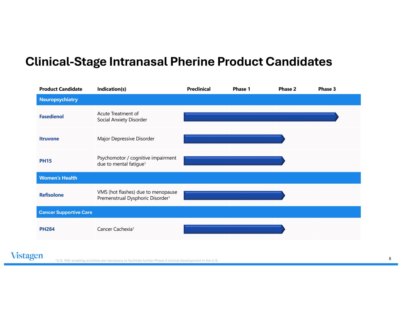 7 Novel MOAs: Pherines have similar proposed MOAs; each is designed to modulate distinct neurocircuits in the brain 1 Monti L & Liebowitz MR, Neural circuits of anxiolytic and antidepressant pherine molecules (2022) and Other Internal Vistagen research 2 Previously known as PH80 1 Olfactory Bulb Nasal Chemosensory Area 2 Hypothalamus Amygdala 4 3 5 Intranasal Delivery Direct Activation of Nasal Chemosensory Neurons (NCNs) NCNs project to Olfactory Bulb Shared Aspects of Proposed MOAs 1 2 3 Modulates Primary Amygdala Circuits1 (fasedienol, itruvone, PH15) Modulates Primary Hypothalamus Circuits (refisolone2, PH284) 4 5 Designed for rapid onset with localized action and no detectable brain or systemic exposure Designed to modulate distinct neural circuits regulating emotion, stress, autonomic function, and metabolism Pherines are designed to avoid systemic absorption, brain uptake, and binding to traditional abuse liability receptors Distinct Aspects of Proposed MOA 1
