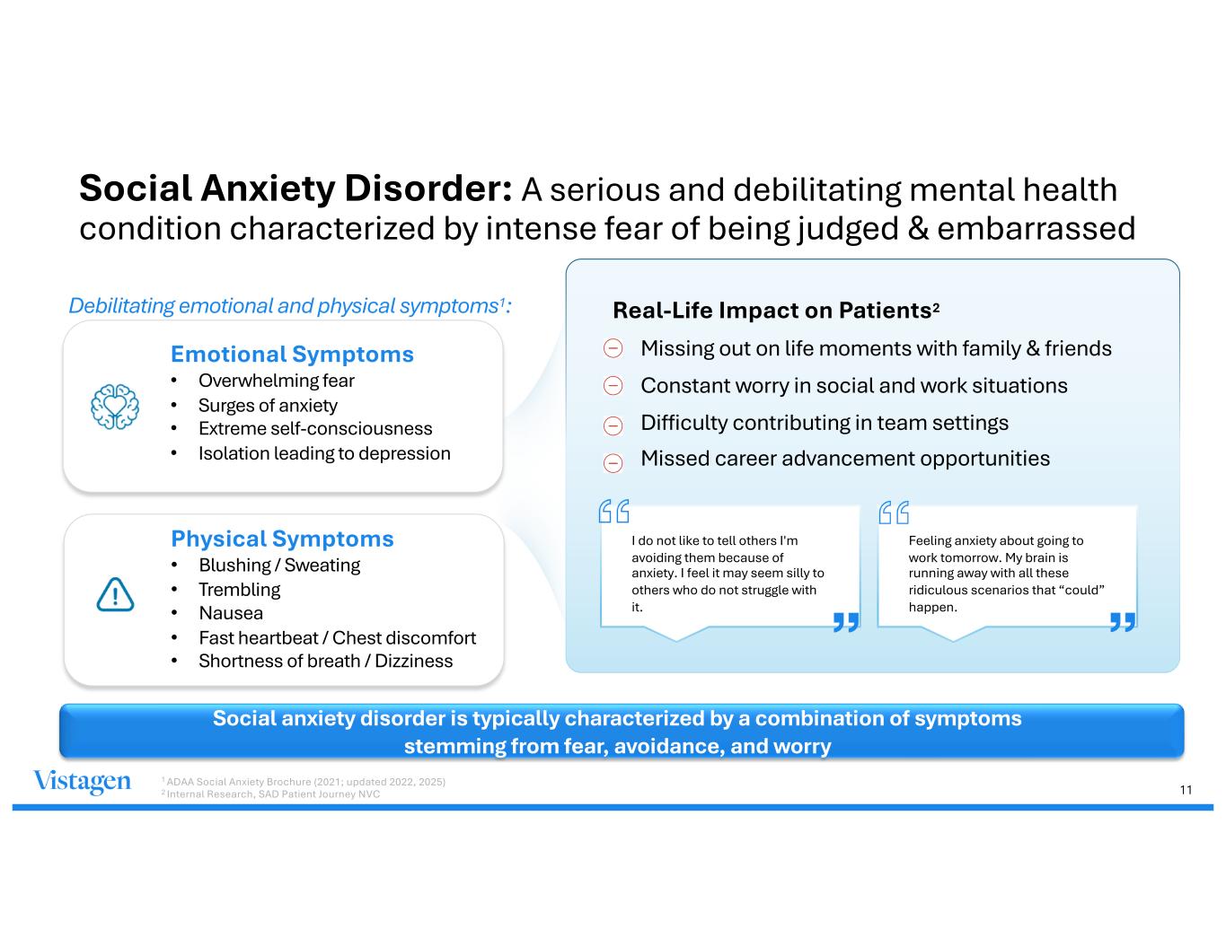 11 Social Anxiety Disorder: A serious and debilitating mental health condition characterized by intense fear of being judged & embarrassed Social anxiety disorder is typically characterized by a combination of symptoms stemming from fear, avoidance, and worry Emotional Symptoms • Overwhelming fear • Surges of anxiety • Extreme self-consciousness • Isolation leading to depression Debilitating emotional and physical symptoms1: Physical Symptoms • Blushing / Sweating • Trembling • Nausea • Fast heartbeat / Chest discomfort • Shortness of breath / Dizziness Real-Life Impact on Patients2 • Missing out on life moments with family & friends • Constant worry in social and work situations • Difficulty contributing in team settings • Missed career advancement opportunities I do not like to tell others I'm avoiding them because of anxiety. I feel it may seem silly to others who do not struggle with it. Feeling anxiety about going to work tomorrow. My brain is running away with all these ridiculous scenarios that “could” happen. 1 ADAA Social Anxiety Brochure (2021; updated 2022, 2025) 2 Internal Research, SAD Patient Journey NVC