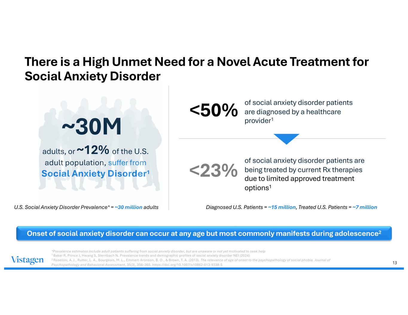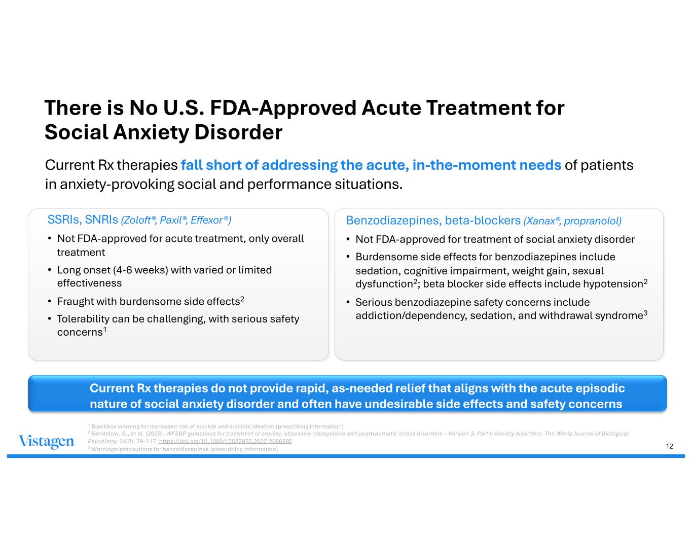 12 There is No U.S. FDA-Approved Acute Treatment for Social Anxiety Disorder Current Rx therapies fall short of addressing the acute, in-the-moment needs of patients in anxiety-provoking social and performance situations. 1 Blackbox warning for increased risk of suicide and suicidal ideation (prescribing information) 2 Bandelow, B., et al. (2023). WFSBP guidelines for treatment of anxiety, obsessive-compulsive and posttraumatic stress disorders – Version 3. Part I: Anxiety disorders. The World Journal of Biological Psychiatry, 24(2), 79–117. https://doi.org/10.1080/15622975.2022.2086295 3 Warnings/precautions for benzodiazepines (prescribing information) SSRIs, SNRIs (Zoloft®, Paxil®, Effexor®) • Not FDA-approved for acute treatment, only overall treatment • Long onset (4-6 weeks) with varied or limited effectiveness • Fraught with burdensome side effects2 • Tolerability can be challenging, with serious safety concerns1 Benzodiazepines, beta-blockers (Xanax®, propranolol) • Not FDA-approved for treatment of social anxiety disorder • Burdensome side effects for benzodiazepines include sedation, cognitive impairment, weight gain, sexual dysfunction2; beta blocker side effects include hypotension2 • Serious benzodiazepine safety concerns include addiction/dependency, sedation, and withdrawal syndrome3 Current Rx therapies do not provide rapid, as-needed relief that aligns with the acute episodic nature of social anxiety disorder and often have undesirable side effects and safety concerns