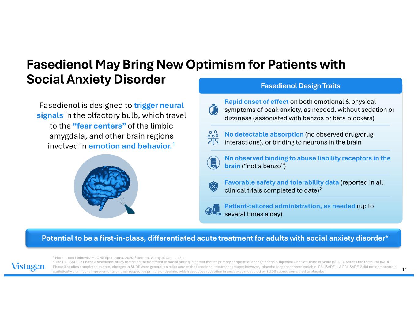 13 Onset of social anxiety disorder can occur at any age but most commonly manifests during adolescence2 ~30M adults, or ~12% of the U.S. adult population, suffer from Social Anxiety Disorder1 U.S. Social Anxiety Disorder Prevalence* = ~30 million adults <50% of social anxiety disorder patients are diagnosed by a healthcare provider1 <23% of social anxiety disorder patients are being treated by current Rx therapies due to limited approved treatment options1 Diagnosed U.S. Patients = ~15 million, Treated U.S. Patients = ~7 million There is a High Unmet Need for a Novel Acute Treatment for Social Anxiety Disorder *Prevalence estimates include adult patients suffering from social anxiety disorder, but are unaware or not yet motivated to seek help 1 Baker R, Prince J, Hwang S, Sternbach N. Prevalence trends and demographic profiles of social anxiety disorder NEI (2024) 2 Rosellini, A. J., Rutter, L. A., Bourgeois, M. L., Emmert-Aronson, B. O., & Brown, T. A. (2013). The relevance of age of onset to the psychopathology of social phobia. Journal of Psychopathology and Behavioral Assessment, 35(3), 356–365. https://doi.org/10.1007/s10862-013-9338-5