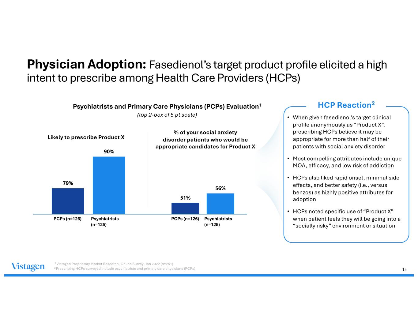 14 Fasedienol May Bring New Optimism for Patients with Social Anxiety Disorder Fasedienol is designed to trigger neural signals in the olfactory bulb, which travel to the “fear centers” of the limbic amygdala, and other brain regions involved in emotion and behavior.1 Fasedienol Design Traits Rapid onset of effect on both emotional & physical symptoms of peak anxiety, as needed, without sedation or dizziness (associated with benzos or beta blockers) No detectable absorption (no observed drug/drug interactions), or binding to neurons in the brain No observed binding to abuse liability receptors in the brain (“not a benzo”) Favorable safety and tolerability data (reported in all clinical trials completed to date)2 Patient-tailored administration, as needed (up to several times a day) 1 Monti L and Liebowitz M. CNS Spectrums. 2020; 2 Internal Vistagen Data on File * The PALISADE-2 Phase 3 fasedienol study for the acute treatment of social anxiety disorder met its primary endpoint of change on the Subjective Units of Distress Scale (SUDS). Across the three PALISADE Phase 3 studies completed to date, changes in SUDS were generally similar across the fasedienol treatment groups; however, placebo responses were variable. PALISADE-1 & PALISADE-3 did not demonstrate statistically significant improvements on their respective primary endpoints, which assessed reduction in anxiety as measured by SUDS scores compared to placebo. Potential to be a first-in-class, differentiated acute treatment for adults with social anxiety disorder*