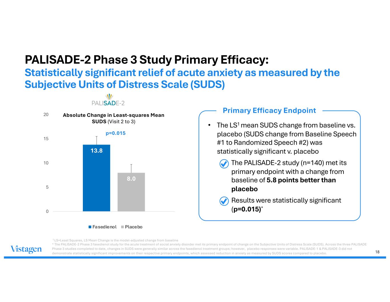 17 PALISADE Phase 3 Public Speaking Challenge Program Design ØKey Inclusions • 18-65 years of age • Social anxiety disorder as defined by DSM-5 • LSAS score≥ 70 at screening • Clinician-rated 17-item Hamilton Depression Rating Scale (HAMD-17) < 16 at screening ØKey Exclusions • No history of psychiatric conditions, suicidal behavior, psychotropic medications, alcohol or substance abuse • No significant nasal pathology Baseline 5 min. PSC 1 -35 to -3 0 7 14 R 1:1 day Visit 1 2 3 4 Screening Randomization 5 min. PSC 2 Primary, Secondary, Exploratory Endpoints 1 Follow-up Safety follow-up Fasedienol 3.2 mcg (100 µL per nostril) Placebo 100 µL per nostril Placebo Visit 2 to Visit 3: Ø Primary Endpoint: LS1 Mean Change in SUDS1 Ø Secondary & Exploratory Endpoints2: • CGI-I proportion of responders • PGI-C proportion of responders Ø Safety: TEAEs 1 LS=Least Squares, LS Mean Change is the model-adjusted change from baseline; SUDS=Subjective Units of Distress Scale 2 PGI-C Proportion of responders was studied as an exploratory endpoint in PALISADE-1,2 studies; in PALISADE-3,4 studies, it is a secondary endpoint
