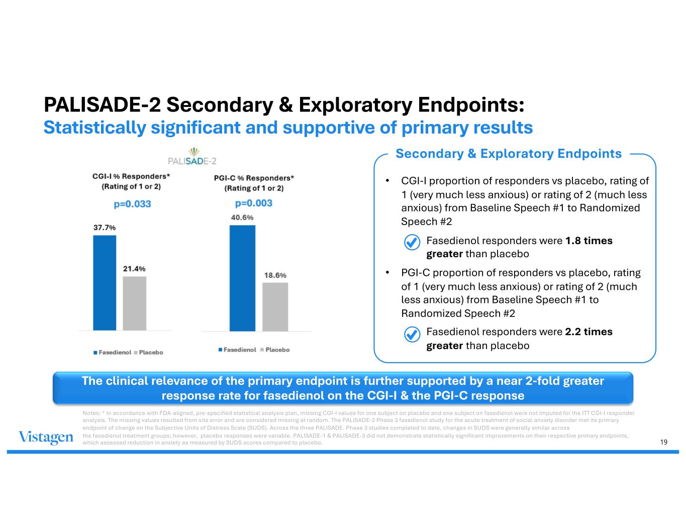 18 PALISADE-2 Phase 3 Study Primary Efficacy: Statistically significant relief of acute anxiety as measured by the Subjective Units of Distress Scale (SUDS) 13.8 8.0 0 5 10 15 20 (p=0.015) Absolute Change in Least-squares Mean SUDS (Visit 2 to 3) Fasedienol Placebo • The LS1 mean SUDS change from baseline vs. placebo (SUDS change from Baseline Speech #1 to Randomized Speech #2) was statistically significant v. placebo • The PALISADE-2 study (n=140) met its primary endpoint with a change from baseline of 5.8 points better than placebo • Results were statistically significant (p=0.015)* Primary Efficacy Endpoint p=0.015 1 LS=Least Squares, LS Mean Change is the model-adjusted change from baseline * The PALISADE-2 Phase 3 fasedienol study for the acute treatment of social anxiety disorder met its primary endpoint of change on the Subjective Units of Distress Scale (SUDS). Across the three PALISADE Phase 3 studies completed to date, changes in SUDS were generally similar across the fasedienol treatment groups; however, placebo responses were variable. PALISADE-1 & PALISADE-3 did not demonstrate statistically significant improvements on their respective primary endpoints, which assessed reduction in anxiety as measured by SUDS scores compared to placebo.