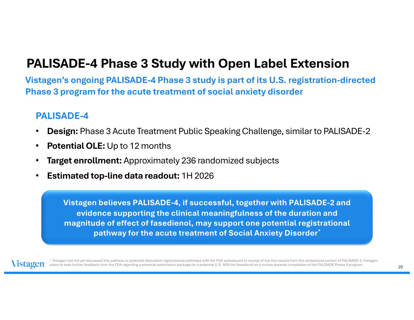 19 PALISADE-2 Secondary & Exploratory Endpoints: Statistically significant and supportive of primary results • CGI-I proportion of responders vs placebo, rating of 1 (very much less anxious) or rating of 2 (much less anxious) from Baseline Speech #1 to Randomized Speech #2 • Fasedienol responders were 1.8 times greater than placebo • PGI-C proportion of responders vs placebo, rating of 1 (very much less anxious) or rating of 2 (much less anxious) from Baseline Speech #1 to Randomized Speech #2 • Fasedienol responders were 2.2 times greater than placebo The clinical relevance of the primary endpoint is further supported by a near 2-fold greater response rate for fasedienol on the CGI-I & the PGI-C response Secondary & Exploratory Endpoints Notes: * In accordance with FDA-aligned, pre-specified statistical analysis plan, missing CGI-I values for one subject on placebo and one subject on fasedienol were not imputed for the ITT CGI-I responder analysis. The missing values resulted from site error and are considered missing at random. The PALISADE-2 Phase 3 fasedienol study for the acute treatment of social anxiety disorder met its primary endpoint of change on the Subjective Units of Distress Scale (SUDS). Across the three PALISADE. Phase 3 studies completed to date, changes in SUDS were generally similar across the fasedienol treatment groups; however, placebo responses were variable. PALISADE-1 & PALISADE-3 did not demonstrate statistically significant improvements on their respective primary endpoints, which assessed reduction in anxiety as measured by SUDS scores compared to placebo.