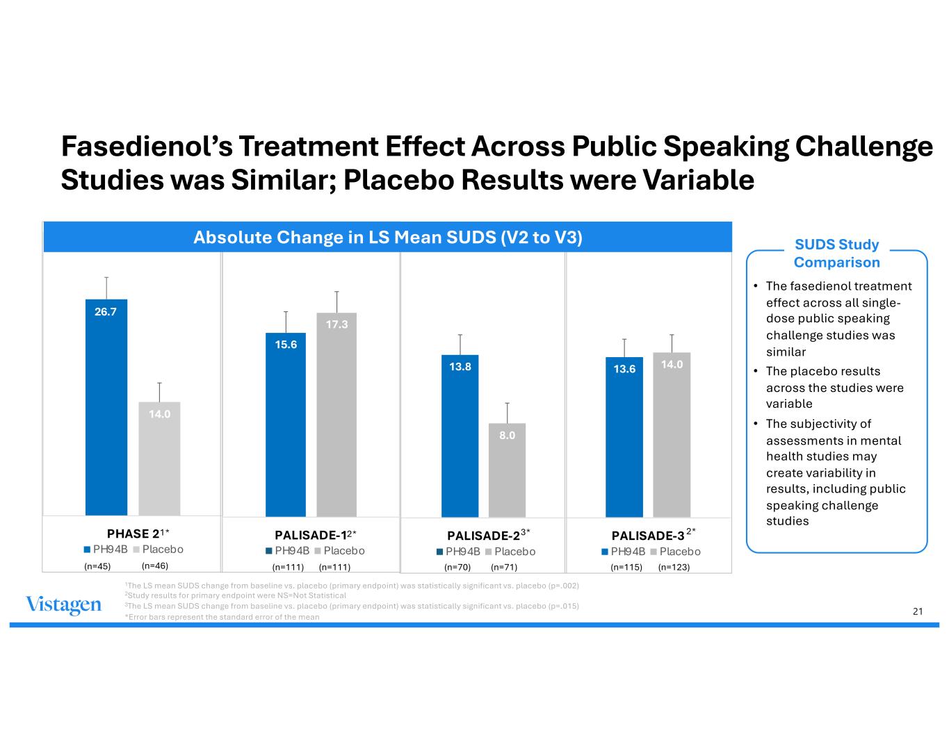 20 PALISADE-4 Phase 3 Study with Open Label Extension PALISADE-4 • Design: Phase 3 Acute Treatment Public Speaking Challenge, similar to PALISADE-2 • Potential OLE: Up to 12 months • Target enrollment: Approximately 236 randomized subjects • Estimated top-line data readout: 1H 2026 Vistagen believes PALISADE-4, if successful, together with PALISADE-2 and evidence supporting the clinical meaningfulness of the duration and magnitude of effect of fasedienol, may support one potential registrational pathway for the acute treatment of Social Anxiety Disorder* Vistagen’s ongoing PALISADE-4 Phase 3 study is part of its U.S. registration-directed Phase 3 program for the acute treatment of social anxiety disorder * Vistagen has not yet discussed this pathway or potential alternative registrational pathways with the FDA subsequent to receipt of top-line results from the randomized portion of PALISADE-3. Vistagen plans to seek further feedback from the FDA regarding a potential submission package for a potential U.S. NDA for fasedienol as it moves towards completion of the PALISADE Phase 3 program.