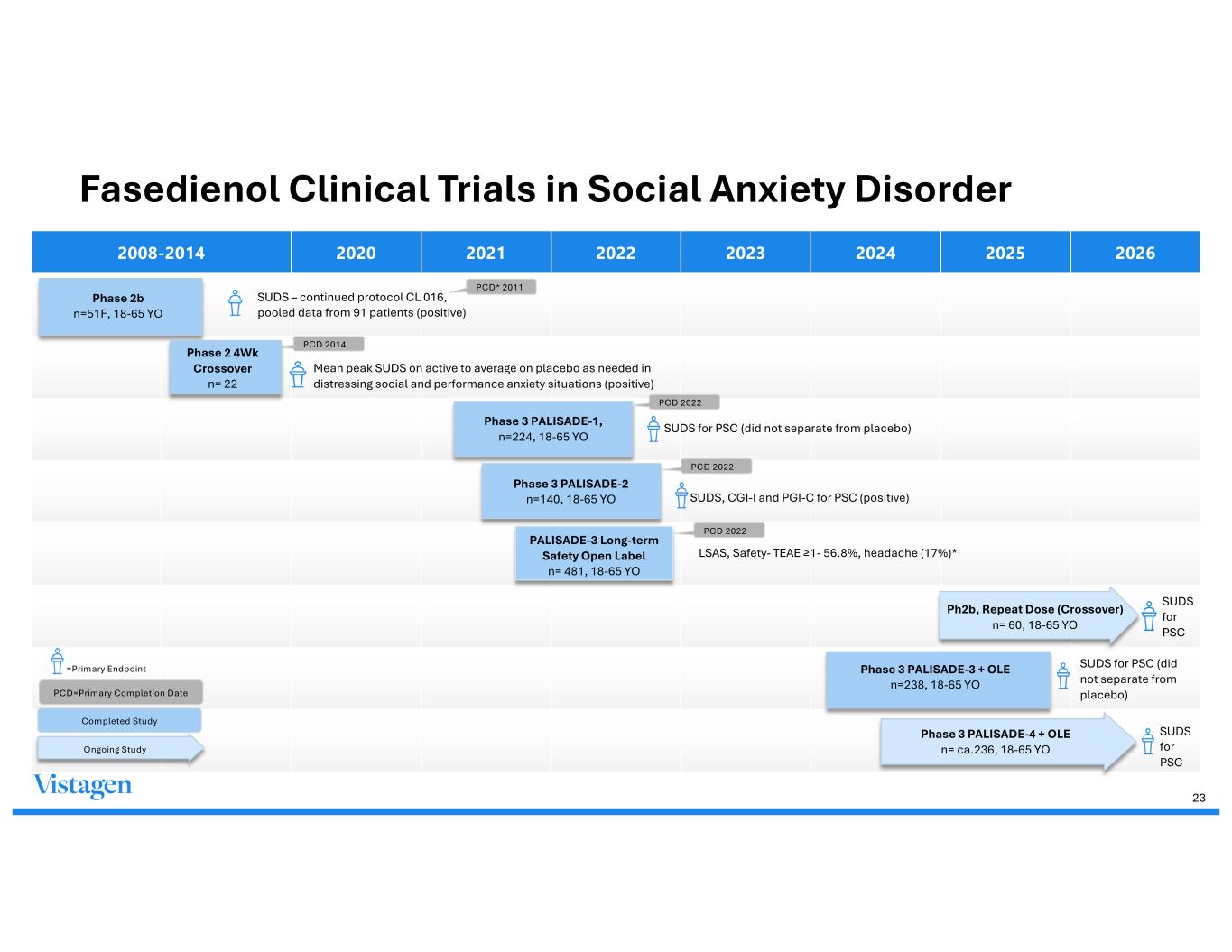 Fasedienol Clinical Trials in Social Anxiety Disorder 2008-2014 2020 2021 2022 2023 2024 2025 2026 SUDS – continued protocol CL 016, pooled data from 91 patients (positive) Mean peak SUDS on active to average on placebo as needed in distressing social and performance anxiety situations (positive) Phase 3 PALISADE-1, n=224, 18-65 YO SUDS for PSC (did not separate from placebo) SUDS, CGI-I and PGI-C for PSC (positive) PALISADE-3 Long-term Safety Open Label n= 481, 18-65 YO LSAS, Safety- TEAE ≥1- 56.8%, headache (17%)* Ph2b, Repeat Dose (Crossover) n= 60, 18-65 YO SUDS for PSC SUDS for PSC (did not separate from placebo) Phase 3 PALISADE-4 + OLE n= ca.236, 18-65 YO SUDS for PSC PCD 2022 Phase 3 PALISADE-3 + OLE n=238, 18-65 YO =Primary Endpoint PCD=Primary Completion Date PCD 2022 PCD 2022 PCD 2014 PCD* 2011 23 Phase 3 PALISADE-2 n=140, 18-65 YO Phase 2b n=51F, 18-65 YO Phase 2 4Wk Crossover n= 22 Completed Study Ongoing Study