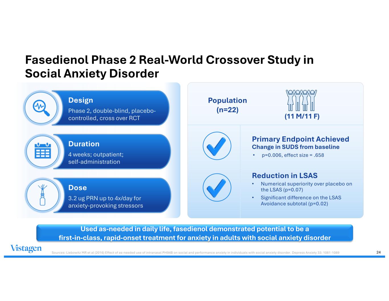 Fasedienol Phase 2 Real-World Crossover Study in Social Anxiety Disorder Sources: Liebowitz MR et al (2016) Effect of as-needed use of intranasal PH94B on social and performance anxiety in individuals with social anxiety disorder. Depress Anxiety 33: 1081-1089 Used as-needed in daily life, fasedienol demonstrated potential to be a first-in-class, rapid-onset treatment for anxiety in adults with social anxiety disorder Design Phase 2, double-blind, placebo- controlled, cross over RCT Dose 3.2 ug PRN up to 4x/day for anxiety-provoking stressors Duration 4 weeks; outpatient; self-administration Primary Endpoint Achieved Change in SUDS from baseline • p=0.006, effect size = .658 Reduction in LSAS • Numerical superiority over placebo on the LSAS (p=0.07) • Significant difference on the LSAS Avoidance subtotal (p=0.02) Population (n=22) (11 M/11 F) 24