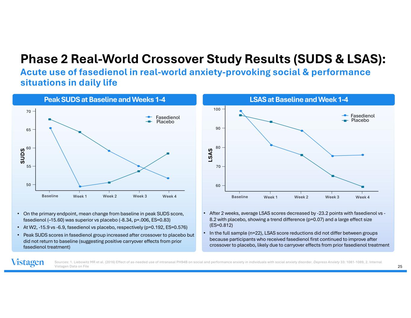 • On the primary endpoint, mean change from baseline in peak SUDS score, fasedienol (–15.60) was superior vs placebo (-8.34, p=.006, ES=0.83) • At W2, -15.9 vs -6.9, fasedienol vs placebo, respectively (p=0.192, ES=0.576) • Peak SUDS scores in fasedienol group increased after crossover to placebo but did not return to baseline (suggesting positive carryover effects from prior fasedienol treatment) • After 2 weeks, average LSAS scores decreased by -23.2 points with fasedienol vs - 8.2 with placebo, showing a trend difference (p=0.07) and a large effect size (ES=0.812) • In the full sample (n=22), LSAS score reductions did not differ between groups because participants who received fasedienol first continued to improve after crossover to placebo, likely due to carryover effects from prior fasedienol treatment 70 65 60 55 50 Baseline Week 1 Week 2 Week 3 Week 4 SU D S Fasedienol Placebo 100 90 80 70 60 LS A S Fasedienol Placebo Baseline Week 1 Week 2 Week 3 Week 4 Sources: 1. Liebowitz MR et al. (2016) Effect of as-needed use of intranasal PH94B on social and performance anxiety in individuals with social anxiety disorder. Depress Anxiety 33: 1081-1089, 2. Internal Vistagen Data on File Phase 2 Real-World Crossover Study Results (SUDS & LSAS): Acute use of fasedienol in real-world anxiety-provoking social & performance situations in daily life Peak SUDS at Baseline and Weeks 1-4 LSAS at Baseline and Week 1-4 25