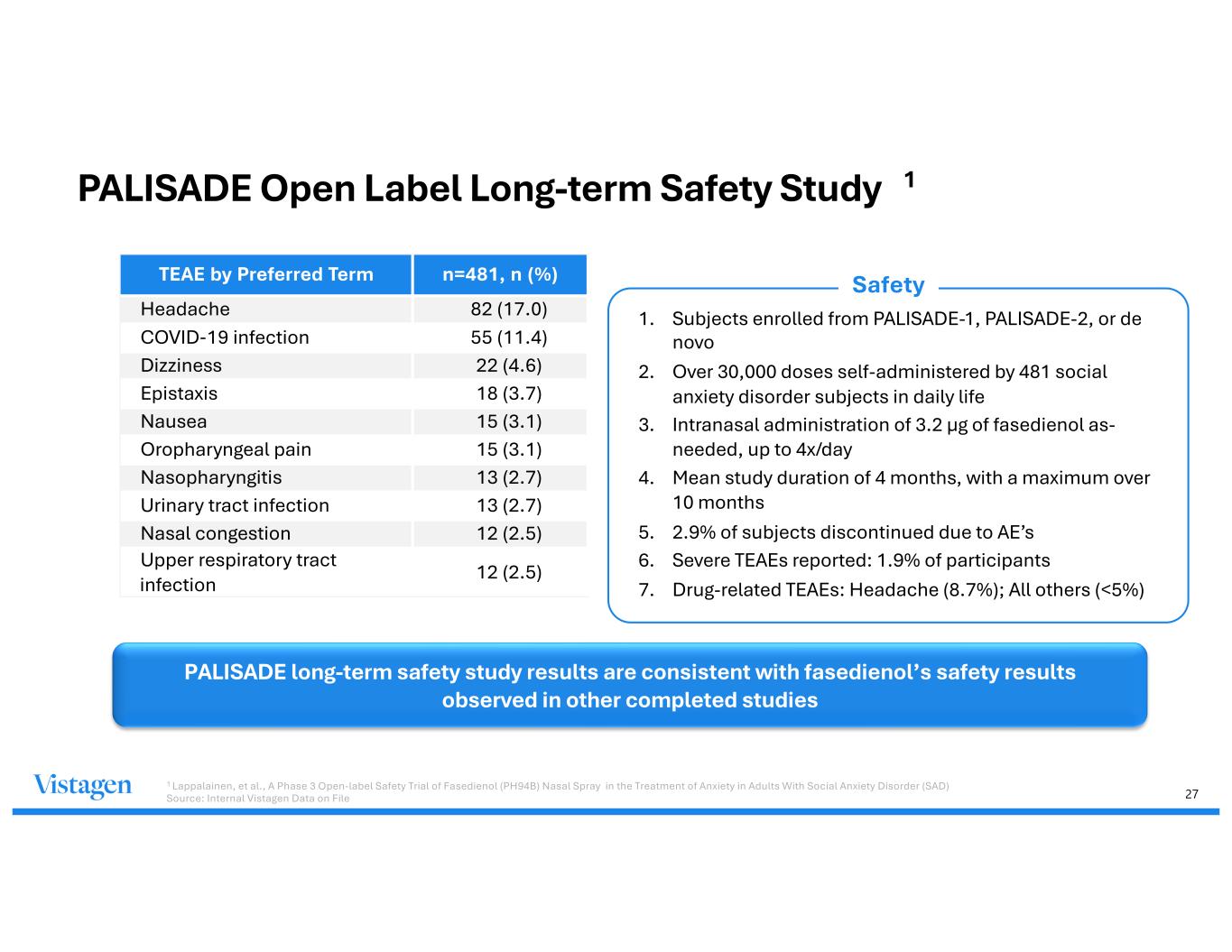 PALISADE Real-World Open Label Safety Study (OLSS) Exploratory Efficacy Objective Evaluate fasedienol's effectiveness in real-world social anxiety Study Duration 4 months, max 10 months study duration Administration 3.2 ug PRN up to 4x/day for anxiety 30K Doses 500 Patients LSAS reduction observed from Month 1 Demonstrated clinically meaningful reductions in fear, anxiety & avoidance of anxiety-provoking social and performance situations in daily life Safety Results Long-term as-needed intranasal administration of 3.2 µg of fasedienol, up to 4x/day, was safe and well-tolerated in adult SAD patients (n=481) 26 Sources: 1. Lappalainen, J. et. al. (2023) A Phase 3 Open-label Safety Trial of Fasedienol (PH94B) Nasal Spray in the Treatment of Anxiety in Adults With Social Anxiety Disorder (SAD). Neuroscience Education Institute (NEI) Annual Meeting, November 10, 2023