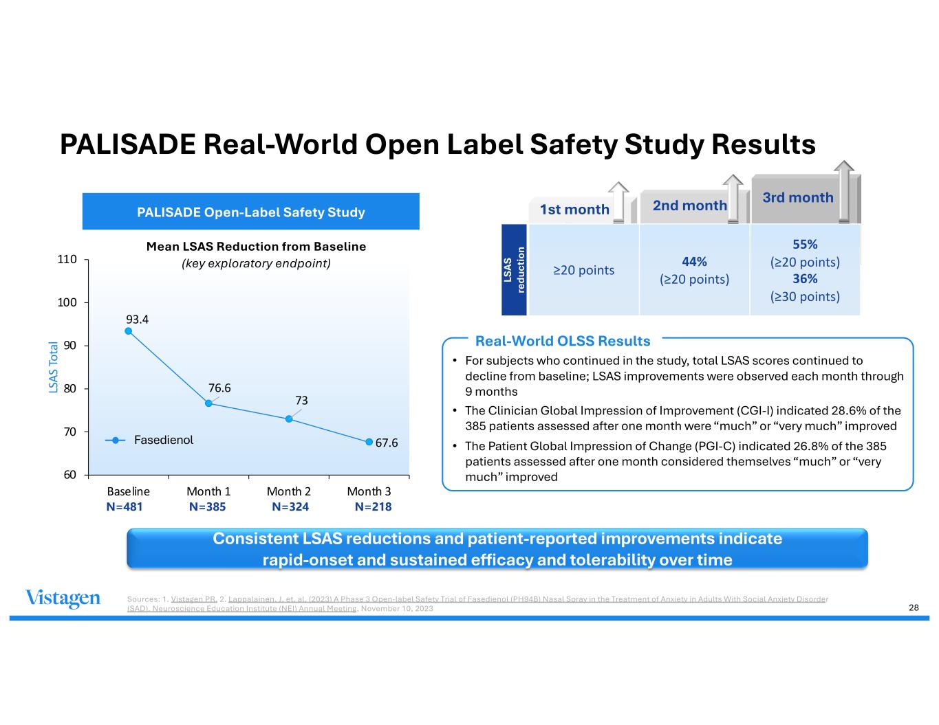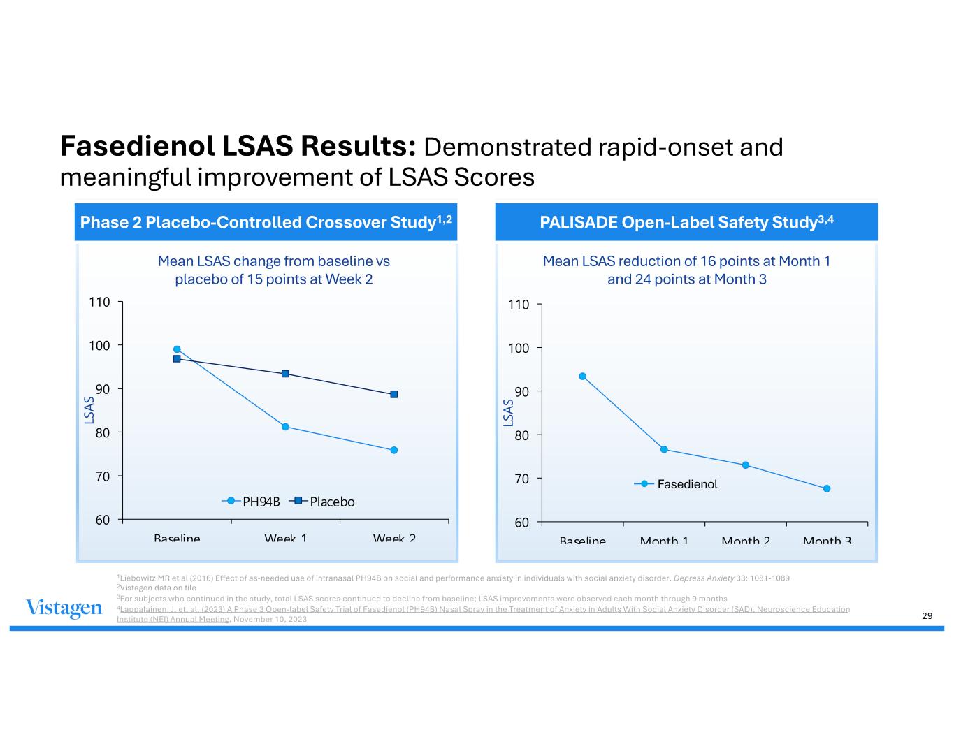 Your Title Here Vestibulum neque elit, Class apt taciti sociosqu ad litora torquent. Your Title Here Vestibulum neque elit, Class apt taciti sociosqu ad litora torquent. Vestibulum neque elit, Class apt taciti sociosqu ad litora torquent. LS AS re du ct io n 93.4 76.6 73 67.6 60 70 80 90 100 110 Baseline Month 1 Month 2 Month 3 LS AS To ta l PALISADE Open-Label Safety Study Mean LSAS Reduction from Baseline (key exploratory endpoint) N=481 N=385 N=324 N=218 ≥20 points 44% (≥20 points) 55% (≥20 points) 36% (≥30 points) Fasedienol PALISADE Real-World Open Label Safety Study Results Consistent LSAS reductions and patient-reported improvements indicate rapid-onset and sustained efficacy and tolerability over time Sources: 1. Vistagen PR, 2. Lappalainen, J. et. al. (2023) A Phase 3 Open-label Safety Trial of Fasedienol (PH94B) Nasal Spray in the Treatment of Anxiety in Adults With Social Anxiety Disorder (SAD). Neuroscience Education Institute (NEI) Annual Meeting, November 10, 2023 1st month 2nd month 3rd month Real-World OLSS Results 28 • For subjects who continued in the study, total LSAS scores continued to decline from baseline; LSAS improvements were observed each month through 9 months • The Clinician Global Impression of Improvement (CGI-I) indicated 28.6% of the 385 patients assessed after one month were “much” or “very much” improved • The Patient Global Impression of Change (PGI-C) indicated 26.8% of the 385 patients assessed after one month considered themselves “much” or “very much” improved