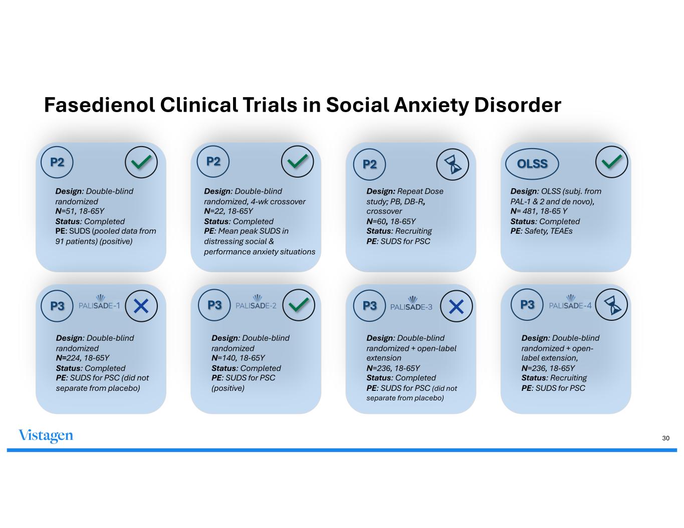 Fasedienol LSAS Results: Demonstrated rapid-onset and meaningful improvement of LSAS Scores 60 70 80 90 100 110 Baseline Week 1 Week 2 LS AS PH94B Placebo 60 70 80 90 100 110 Baseline Month 1 Month 2 Month 3 LS AS Mean LSAS reduction of 16 points at Month 1 and 24 points at Month 3 Mean LSAS change from baseline vs placebo of 15 points at Week 2 Fasedienol 1Liebowitz MR et al (2016) Effect of as-needed use of intranasal PH94B on social and performance anxiety in individuals with social anxiety disorder. Depress Anxiety 33: 1081-1089 2Vistagen data on file 3For subjects who continued in the study, total LSAS scores continued to decline from baseline; LSAS improvements were observed each month through 9 months 4Lappalainen, J. et. al. (2023) A Phase 3 Open-label Safety Trial of Fasedienol (PH94B) Nasal Spray in the Treatment of Anxiety in Adults With Social Anxiety Disorder (SAD). Neuroscience Education Institute (NEI) Annual Meeting, November 10, 2023 Phase 2 Placebo-Controlled Crossover Study1,2 PALISADE Open-Label Safety Study3,4 29