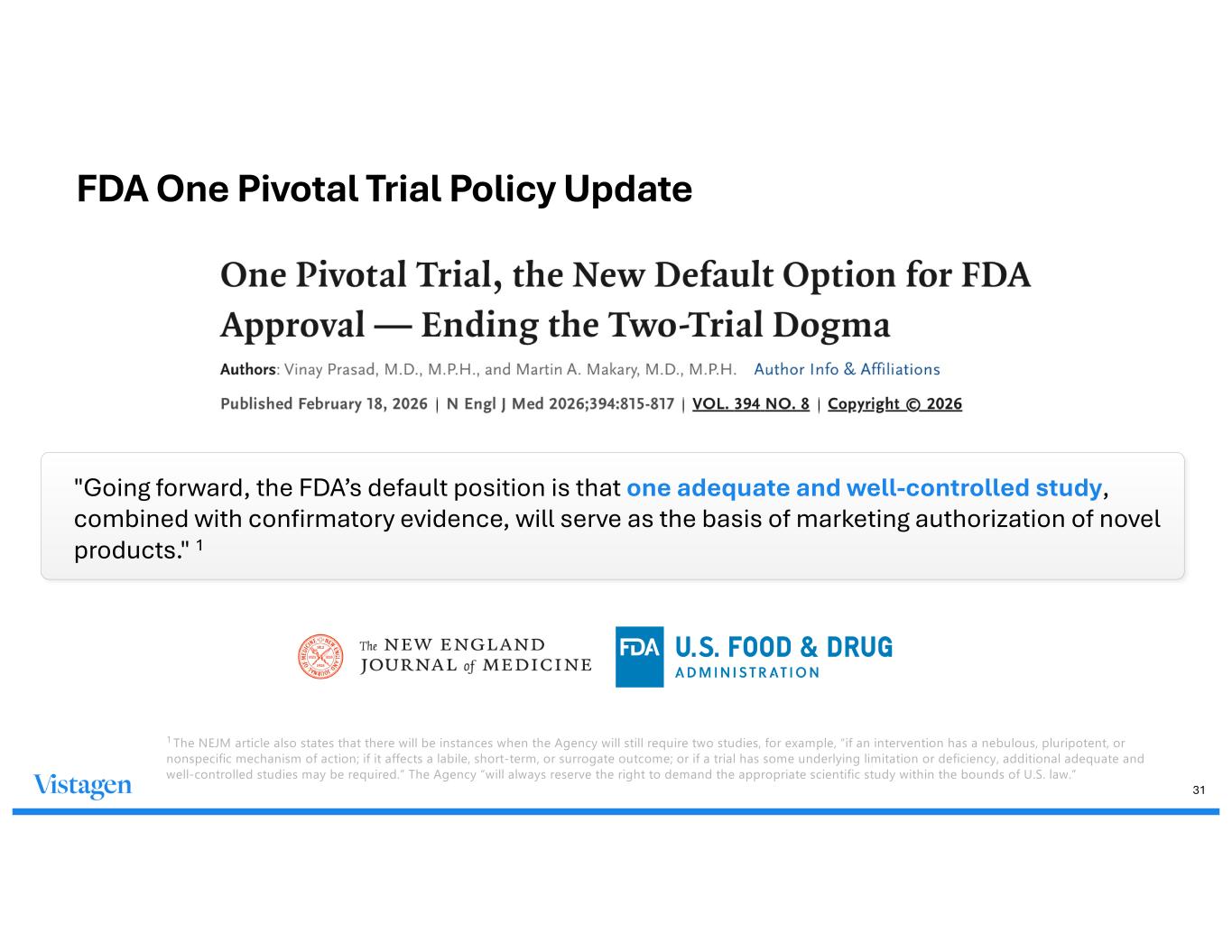 31 "Going forward, the FDA’s default position is that one adequate and well-controlled study, combined with confirmatory evidence, will serve as the basis of marketing authorization of novel products." 1 1 The NEJM article also states that there will be instances when the Agency will still require two studies, for example, “if an intervention has a nebulous, pluripotent, or nonspecific mechanism of action; if it affects a labile, short-term, or surrogate outcome; or if a trial has some underlying limitation or deficiency, additional adequate and well-controlled studies may be required.” The Agency “will always reserve the right to demand the appropriate scientific study within the bounds of U.S. law.” FDA One Pivotal Trial Policy Update