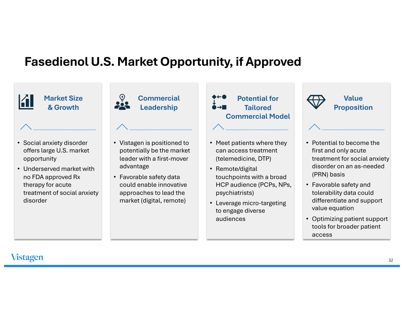 32 Fasedienol U.S. Market Opportunity, if Approved Market Size & Growth Commercial Leadership Potential for Tailored Commercial Model Value Proposition • Social anxiety disorder offers large U.S. market opportunity • Underserved market with no FDA approved Rx therapy for acute treatment of social anxiety disorder • Vistagen is positioned to potentially be the market leader with a first-mover advantage • Favorable safety data could enable innovative approaches to lead the market (digital, remote) • Meet patients where they can access treatment (telemedicine, DTP) • Remote/digital touchpoints with a broad HCP audience (PCPs, NPs, psychiatrists) • Leverage micro-targeting to engage diverse audiences • Potential to become the first and only acute treatment for social anxiety disorder on an as-needed (PRN) basis • Favorable safety and tolerability data could differentiate and support value equation • Optimizing patient support tools for broader patient access