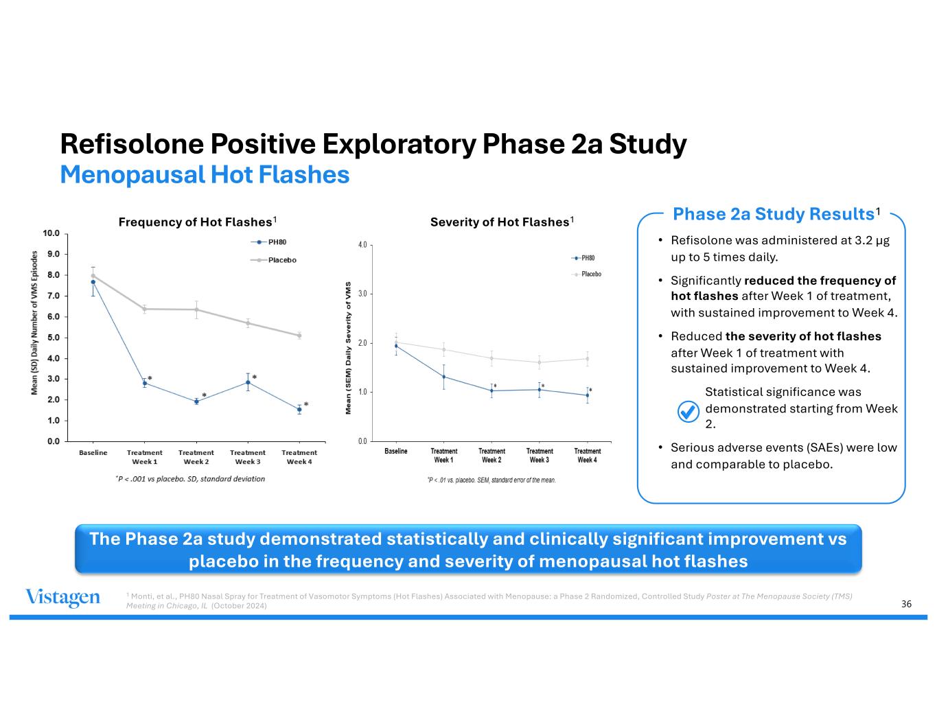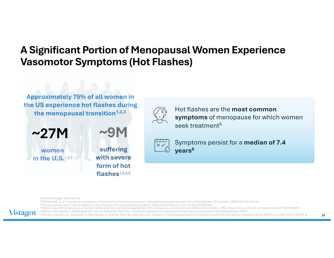 34 A Significant Portion of Menopausal Women Experience Vasomotor Symptoms (Hot Flashes) ~27M women in the U.S.1,2,3 ~9M suffering with severe form of hot flashes1,2,3,4 Symptoms persist for a median of 7.4 years6 Hot flashes are the most common symptoms of menopause for which women seek treatment5 Approximately 75% of all women in the US experience hot flashes during the menopausal transition1,2,3 1Internal Vistagen Data on File 2 Williams RE, et al. Frequency and severity of vasomotor symptoms among peri- and postmenopausal women in the United States. Climacteric. 2008 Feb;11(1):32-43. 3 Premenopausal vasomotor symptoms in an ethnically diverse population –PubMed (https://pubmed.ncbi.nlm.nih.gov/23760434/) 4 Global cross-sectional survey of women with vasomotor symptoms associated with menopause; prevalence and quality of life burden – PMC (https://pmc.ncbi.nlm.nih.gov/articles/PMC8746897/) 5 Williams RE, Kalilani L, DiBenedetti DB, Zhou X, Fehnel SE, Clark RV., Healthcare seeking and treatment for menopausal symptoms in the United States (2007) 6 Avis NE, Crawford SL, Greendale G, Bromberger JT, Everson-Rose SA, Gold EB, et al., Duration of menopausal vasomotor symptoms over the menopause transition (2015) JAMA Intern Med. 2015;175:531-9