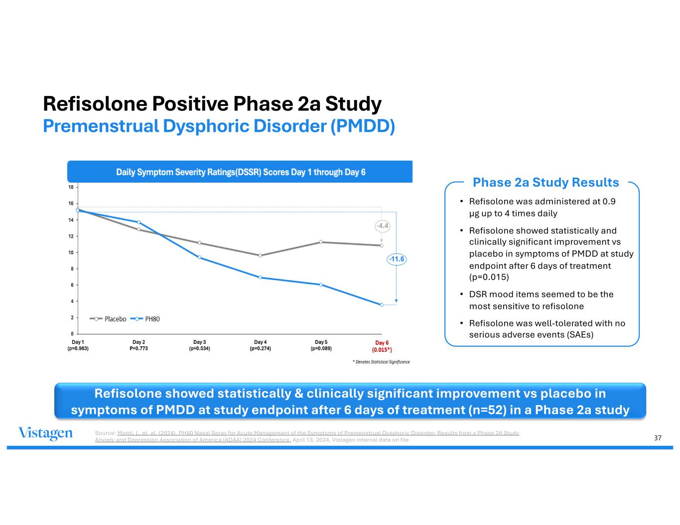 37 Refisolone Positive Phase 2a Study Premenstrual Dysphoric Disorder (PMDD) Refisolone showed statistically & clinically significant improvement vs placebo in symptoms of PMDD at study endpoint after 6 days of treatment (n=52) in a Phase 2a study Phase 2a Study Results • Refisolone was administered at 0.9 µg up to 4 times daily • Refisolone showed statistically and clinically significant improvement vs placebo in symptoms of PMDD at study endpoint after 6 days of treatment (p=0.015) • DSR mood items seemed to be the most sensitive to refisolone • Refisolone was well-tolerated with no serious adverse events (SAEs) Source: Monti, L. et. al. (2024). PH80 Nasal Spray for Acute Management of the Symptoms of Premenstrual Dysphoric Disorder: Results from a Phase 2A Study. Anxiety and Depression Association of America (ADAA) 2024 Conference. April 13, 2024, Vistagen internal data on file
