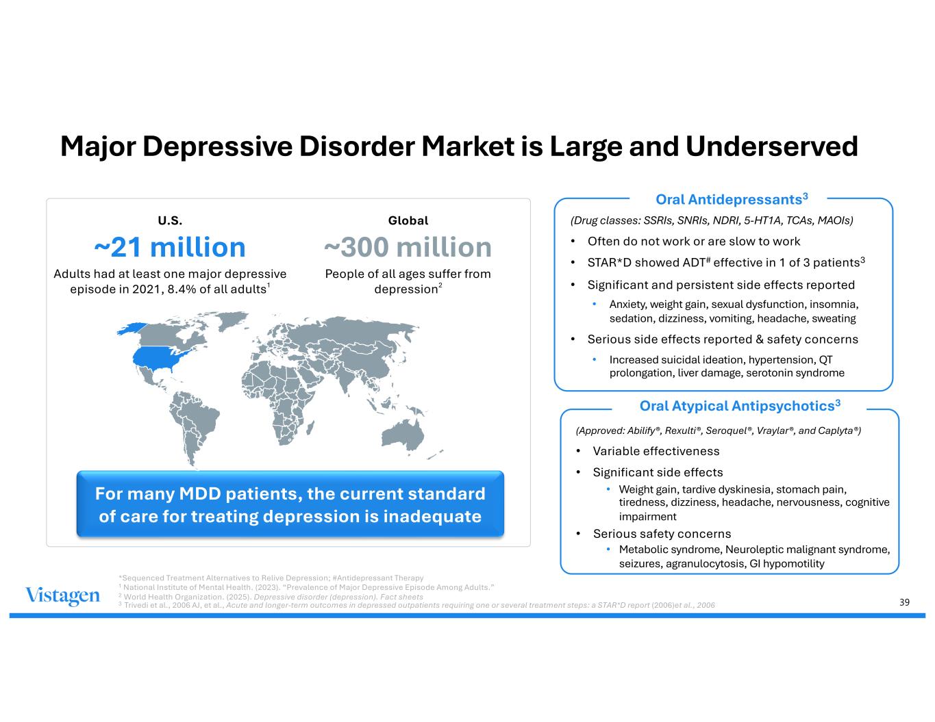 39 Major Depressive Disorder Market is Large and Underserved (Drug classes: SSRIs, SNRIs, NDRI, 5-HT1A, TCAs, MAOIs) • Often do not work or are slow to work • STAR*D showed ADT# effective in 1 of 3 patients3 • Significant and persistent side effects reported • Anxiety, weight gain, sexual dysfunction, insomnia, sedation, dizziness, vomiting, headache, sweating • Serious side effects reported & safety concerns • Increased suicidal ideation, hypertension, QT prolongation, liver damage, serotonin syndrome For many MDD patients, the current standard of care for treating depression is inadequate U.S. ~21 million Adults had at least one major depressive episode in 2021, 8.4% of all adults1 Global ~300 million People of all ages suffer from depression2 *Sequenced Treatment Alternatives to Relive Depression; #Antidepressant Therapy 1 National Institute of Mental Health. (2023). “Prevalence of Major Depressive Episode Among Adults.” 2 World Health Organization. (2025). Depressive disorder (depression). Fact sheets 3 Trivedi et al., 2006 AJ, et al., Acute and longer-term outcomes in depressed outpatients requiring one or several treatment steps: a STAR*D report (2006)et al., 2006 Oral Antidepressants3 (Approved: Abilify®, Rexulti®, Seroquel®, Vraylar®, and Caplyta®) • Variable effectiveness • Significant side effects • Weight gain, tardive dyskinesia, stomach pain, tiredness, dizziness, headache, nervousness, cognitive impairment • Serious safety concerns • Metabolic syndrome, Neuroleptic malignant syndrome, seizures, agranulocytosis, GI hypomotility Oral Atypical Antipsychotics3