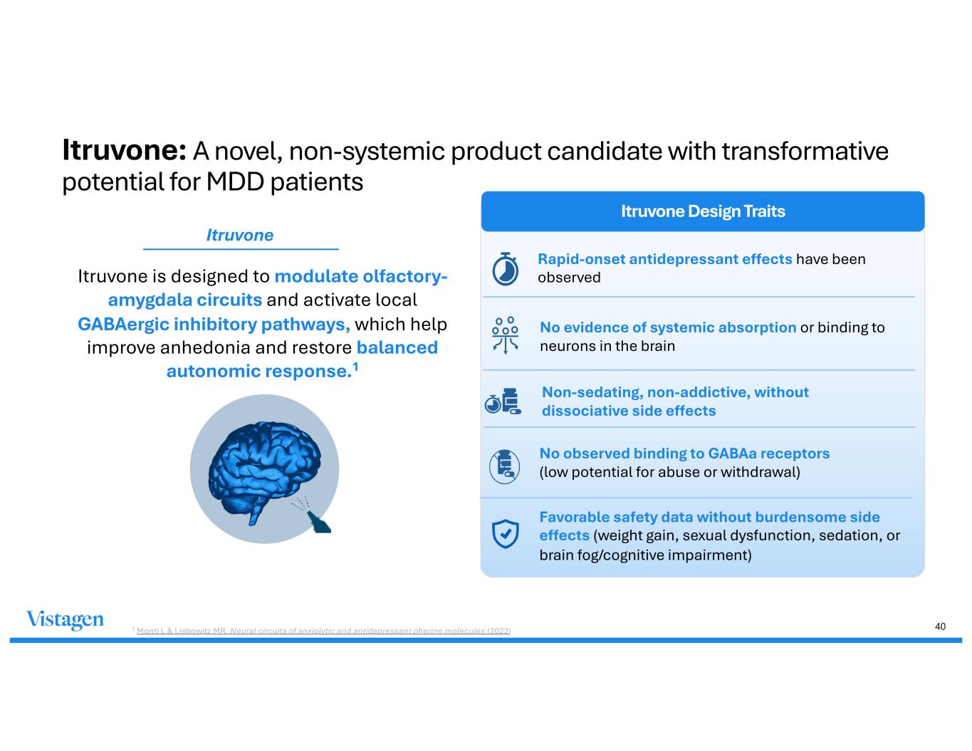 40 Itruvone is designed to modulate olfactory- amygdala circuits and activate local GABAergic inhibitory pathways, which help improve anhedonia and restore balanced autonomic response.1 Itruvone Design Traits Rapid-onset antidepressant effects have been observed No evidence of systemic absorption or binding to neurons in the brain 1 Monti L & Liebowitz MR, Neural circuits of anxiolytic and antidepressant pherine molecules (2022) No observed binding to GABAa receptors (low potential for abuse or withdrawal) Favorable safety data without burdensome side effects (weight gain, sexual dysfunction, sedation, or brain fog/cognitive impairment) Non-sedating, non-addictive, without dissociative side effects Itruvone Itruvone: A novel, non-systemic product candidate with transformative potential for MDD patients