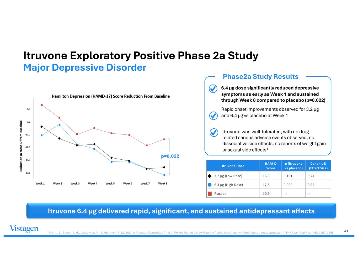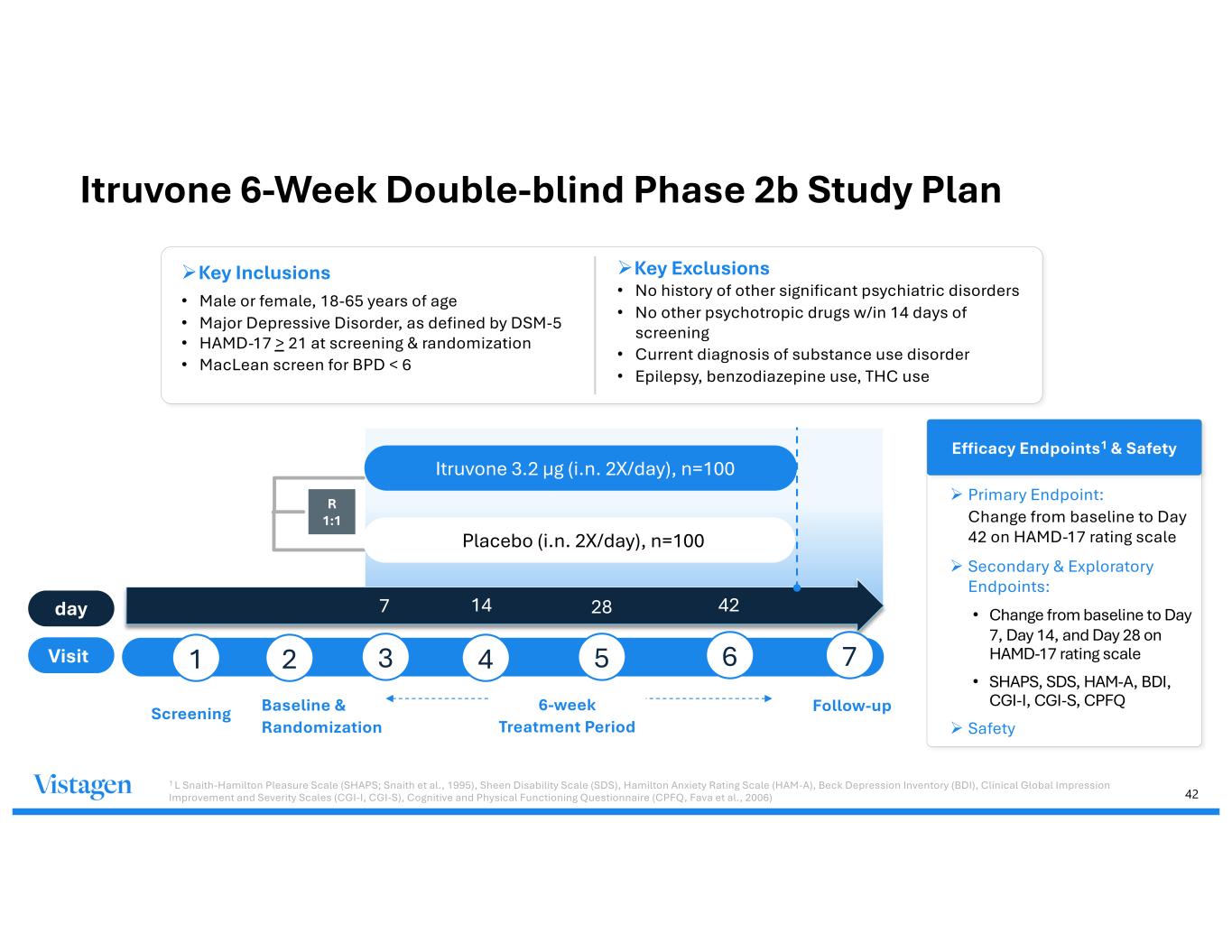 41 Itruvone Exploratory Positive Phase 2a Study Major Depressive Disorder • 6.4 µg dose significantly reduced depressive symptoms as early as Week 1 and sustained through Week 8 compared to placebo (p=0.022) • Rapid onset improvements observed for 3.2 µg and 6.4 µg vs placebo at Week 1 Phase2a Study Results Itruvone 6.4 µg delivered rapid, significant, and sustained antidepressant effects Itruvone Dose HAM-D Score p (itruvone vs placebo) Cohen’s D (Effect Size) 3.2 µg (Low Dose) -16.3 0.101 0.74 6.4 µg (High Dose) -17.8 0.022 0.95 Placebo -10.9 -- -- p=0.022 1 Monti, L., Nicolini, H., Liebowitz, M., & Hanover, R. (2019). “A Placebo Controlled Trial of PH10: Test of a New Rapidly Acting Intranasally Administered Antidepressant.” Br J Phar Med Res 4(6): 2157-2168. • Itruvone was well-tolerated, with no drug- related serious adverse events observed, no dissociative side effects, no reports of weight gain or sexual side effects1