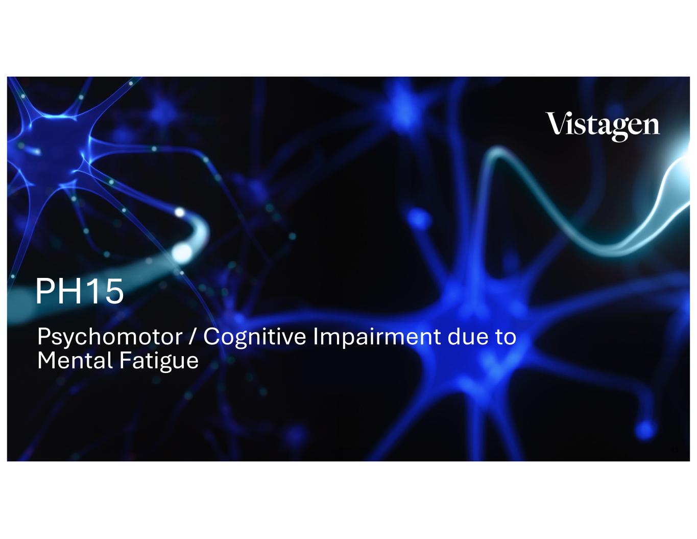 44 PH15: A novel, fast-acting, non-systemic clinical-stage product candidate designed for the acute treatment of cognitive/psychomotor impairment due to mental fatigue PH15 is designed to modulate hippocampal activity and related limbic circuitry, which may support improvements in cognitive and psychomotor function due to mental fatigue. PH15 Design Traits Novel neurocircuitry-focused proposed MOA differentiated from all other approved treatments Rapid-onset potential to be taken as-needed to provide relief in the moment Favorable tolerability results observed in studies completed to date Potential new treatment to improve psychomotor impairment and potentially cognitive impairment due to mental fatigue from sleep deprivation1 PH15 Positive Phase 2a pilot study (n=10) demonstrated significant improvement in reaction time vs placebo and oral caffeine, including during peak fatigue 1 Vistagen does not yet have statistically significant data on PH15 for cognitive impairment due to mental fatigue