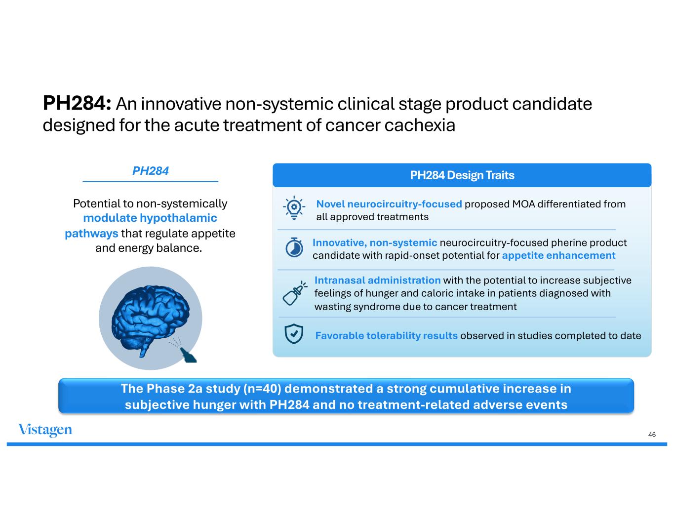 46 PH284: An innovative non-systemic clinical stage product candidate designed for the acute treatment of cancer cachexia Potential to non-systemically modulate hypothalamic pathways that regulate appetite and energy balance. PH284 Design Traits Novel neurocircuitry-focused proposed MOA differentiated from all approved treatments Innovative, non-systemic neurocircuitry-focused pherine product candidate with rapid-onset potential for appetite enhancement Intranasal administration with the potential to increase subjective feelings of hunger and caloric intake in patients diagnosed with wasting syndrome due to cancer treatment Favorable tolerability results observed in studies completed to date PH284 The Phase 2a study (n=40) demonstrated a strong cumulative increase in subjective hunger with PH284 and no treatment-related adverse events