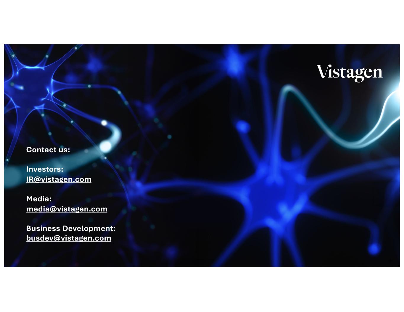 47 Contact us: Investors: IR@vistagen.com Media: media@vistagen.com Business Development: busdev@vistagen.com